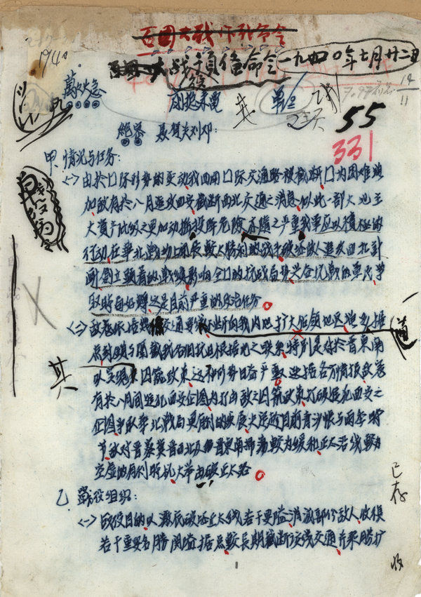 為粉碎侵華日軍的“囚籠政策”、遏制國民黨頑固派的妥協(xié)投降逆流,1940年8月至翌年1月,中國共產(chǎn)黨領(lǐng)導(dǎo)的八路軍在華北發(fā)動了百團大戰(zhàn)。百團大戰(zhàn)第一階段以破襲正太鐵路為重點,這是1940年7月22日簽發(fā)的破襲正太路戰(zhàn)役預(yù)備命令(中央檔案館提供)。