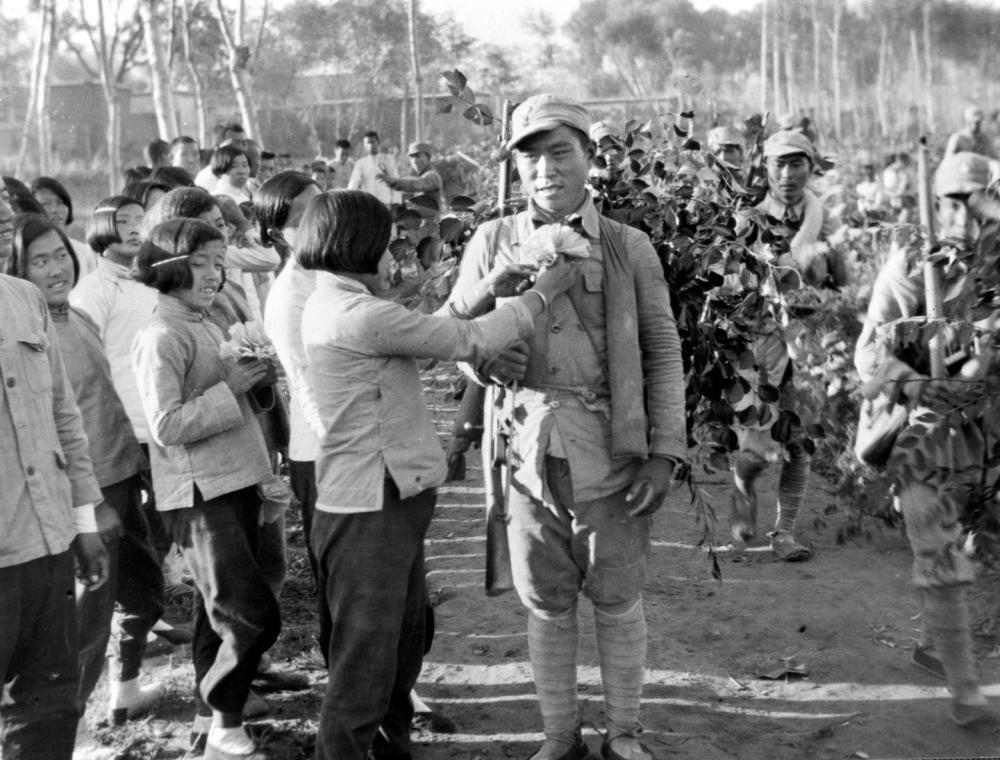 這是老百姓為百團大戰(zhàn)勝利歸來的英雄佩戴光榮花(中國照片檔案館館藏)。