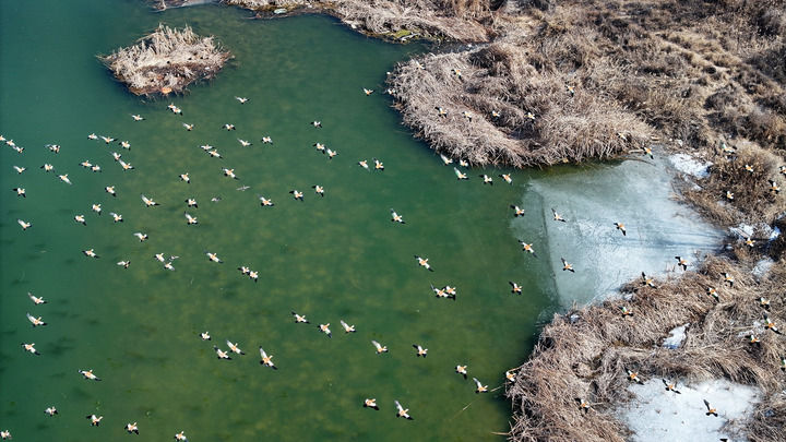 候鳥在黃河寧夏段一處濕地棲息、覓食(2025年2月26日攝,無人機照片)。
