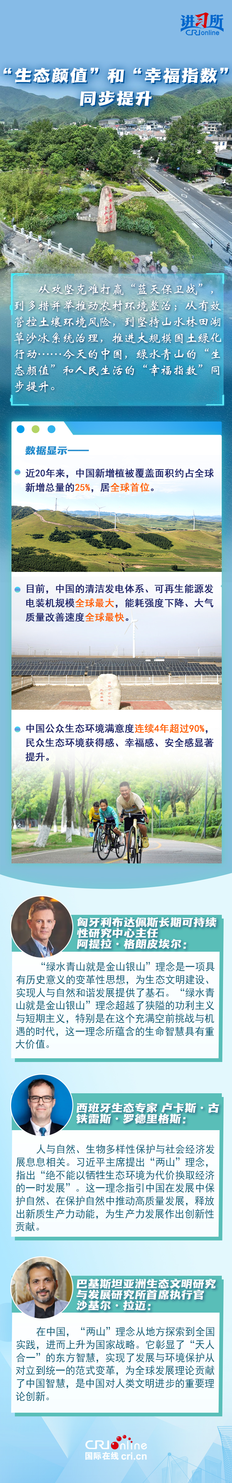 “從歷史長河來看,如果說我們這一代人能留給后人點什么,我看生態(tài)文明建設就是很重要的一個方面。生態(tài)文明建設最能給老百姓帶來獲得感,環(huán)境改善了,老百姓體會也最深?!?0年前,時任中共浙江省委書記的習近平在安吉余村考察時,肯定了余村下定決心關閉礦區(qū)、全面走綠色發(fā)展之路的做法,并首次提出“綠水青山就是金山銀山”重要理念,20年來,這一重要理念帶給中國大地一場革命性變化,直接推動美麗中國建設取得歷史性成就。