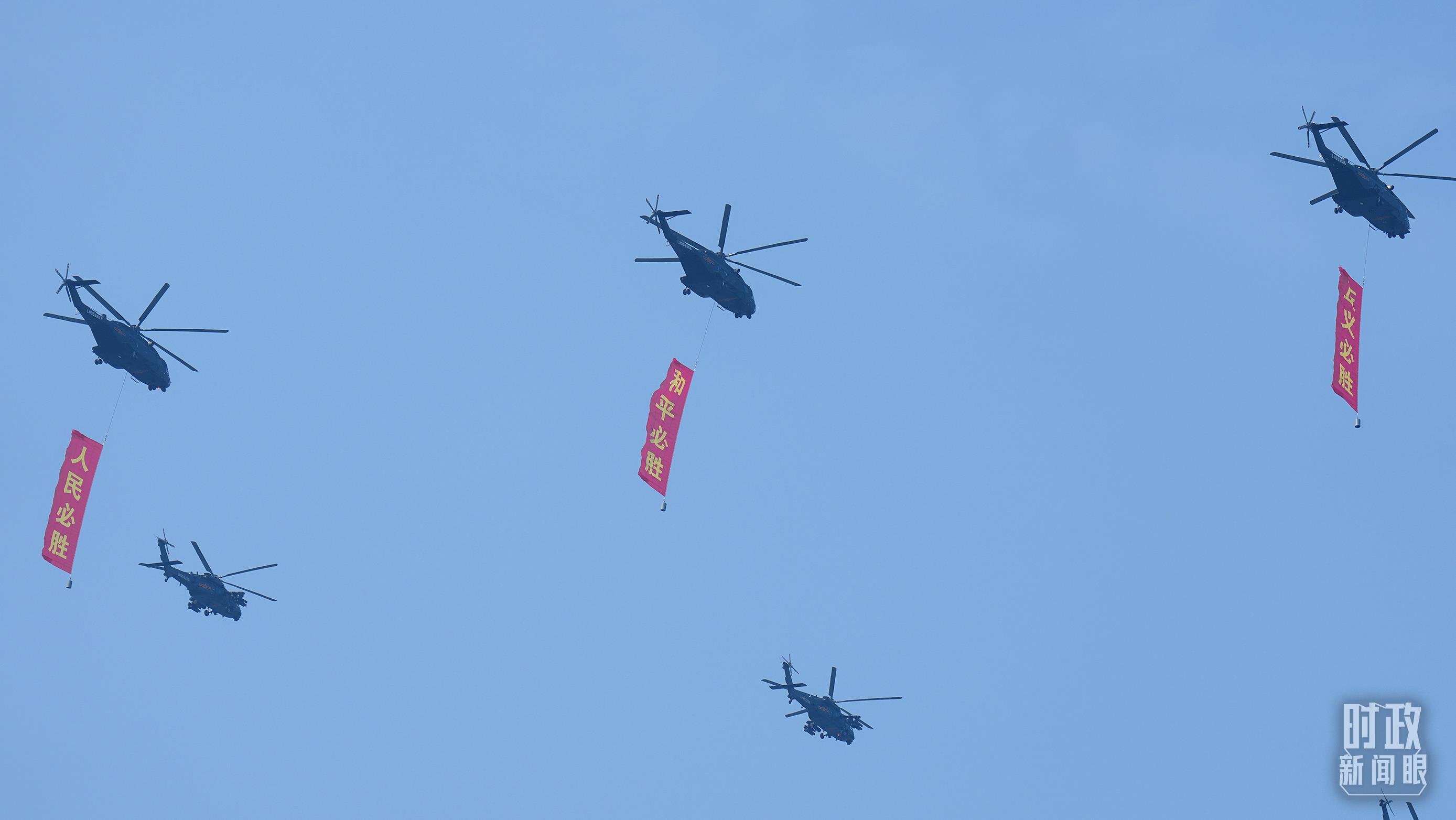 △9月3日,3架直升機(jī)分別懸掛“正義必勝”“和平必勝”“人民必勝”條幅飛過天安門廣場。(總臺(tái)記者李晉拍攝)