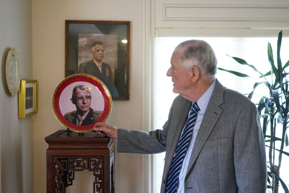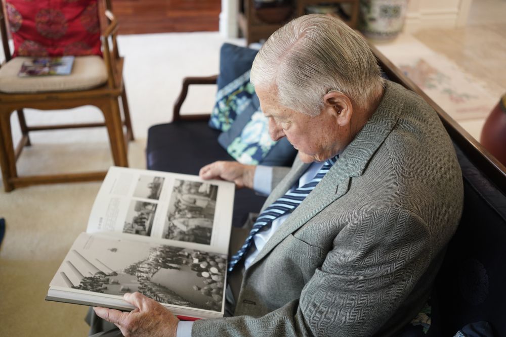 在位于美國舊金山灣區(qū)的家中,耄耋之年的伊斯特布魯克接受新華社記者專訪時,特意翻出了一張日本在“密蘇里”號戰(zhàn)列艦上簽署無條件投降書的老照片,用手指著照片中甲板上軍官站立的一側(cè),“史迪威就在這里”。