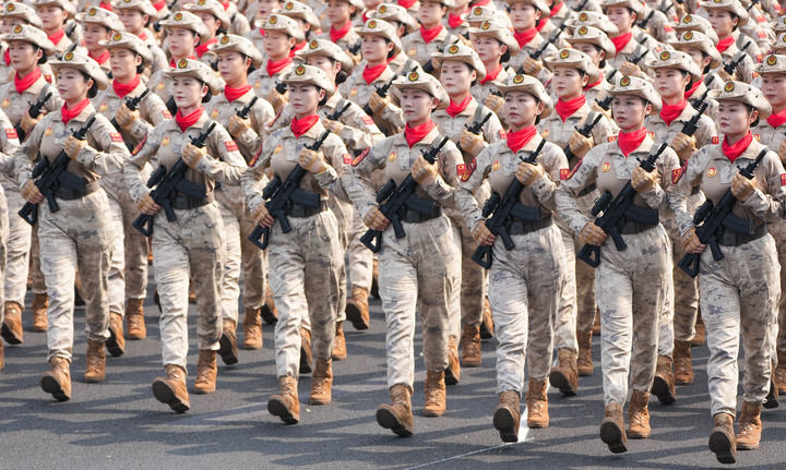 9月3日,天安門廣場。身著蛙式作訓(xùn)服、手握鋼槍的女民兵,身姿挺拔、英姿颯爽。她們來自當年的主要抗日根據(jù)地。這是民兵首次亮相以紀念抗戰(zhàn)為主題的閱兵活動。