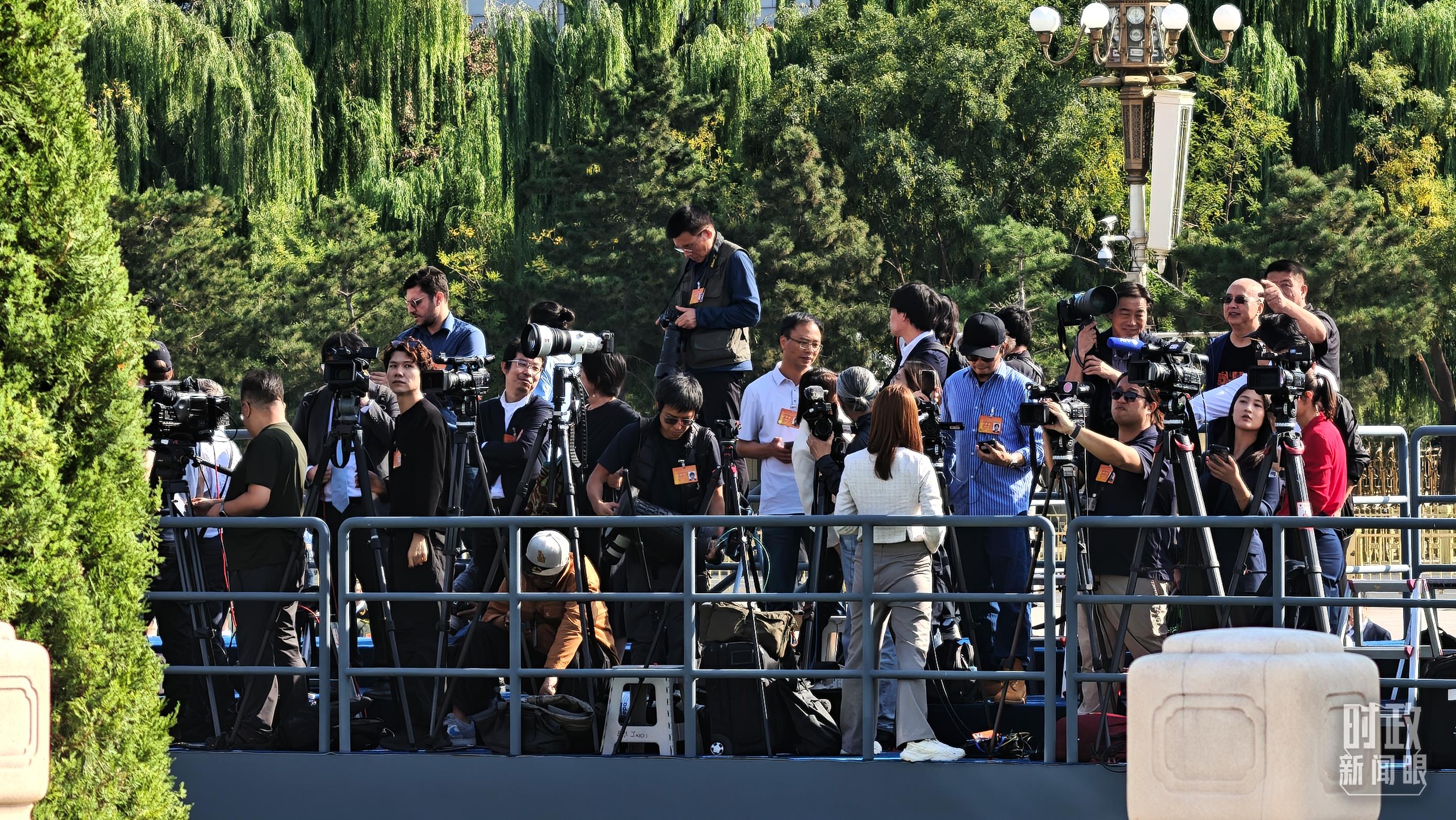 9月30日,天安門廣場(chǎng)上現(xiàn)場(chǎng)報(bào)道的記者。(總臺(tái)央視記者鄂介甫拍攝)