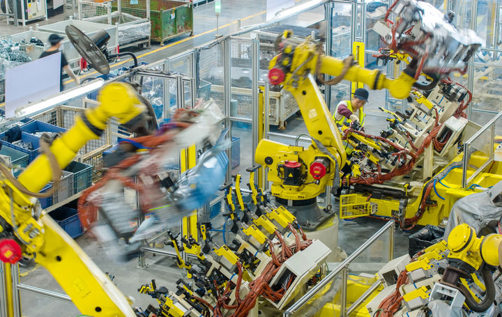 2025年10月9日,浙江省湖州市長興經(jīng)濟技術開發(fā)區(qū)一家汽車部件有限公司的技術人員操控工業(yè)機器人生產(chǎn)新能源汽車配件(無人機照片)。新華社發(fā)(譚云俸攝)
