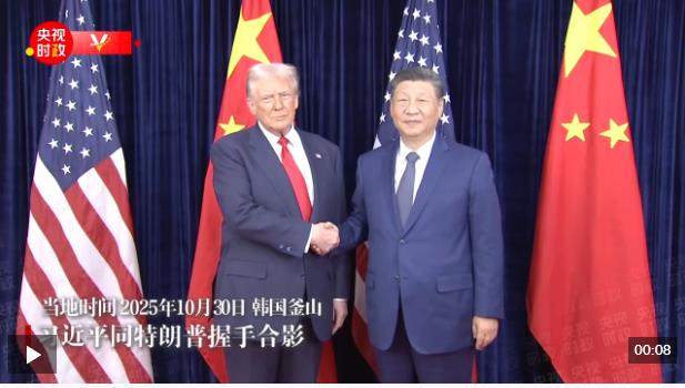 當?shù)貢r間10月30日中午,中美元首會晤開始前,習(xí)近平同特朗普握手合影。