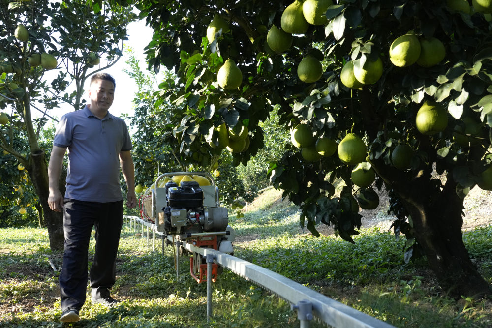 2025年11月7日,在梅州南福金柚種植基地,柚農(nóng)通過(guò)山地運(yùn)輸車運(yùn)輸柚子。