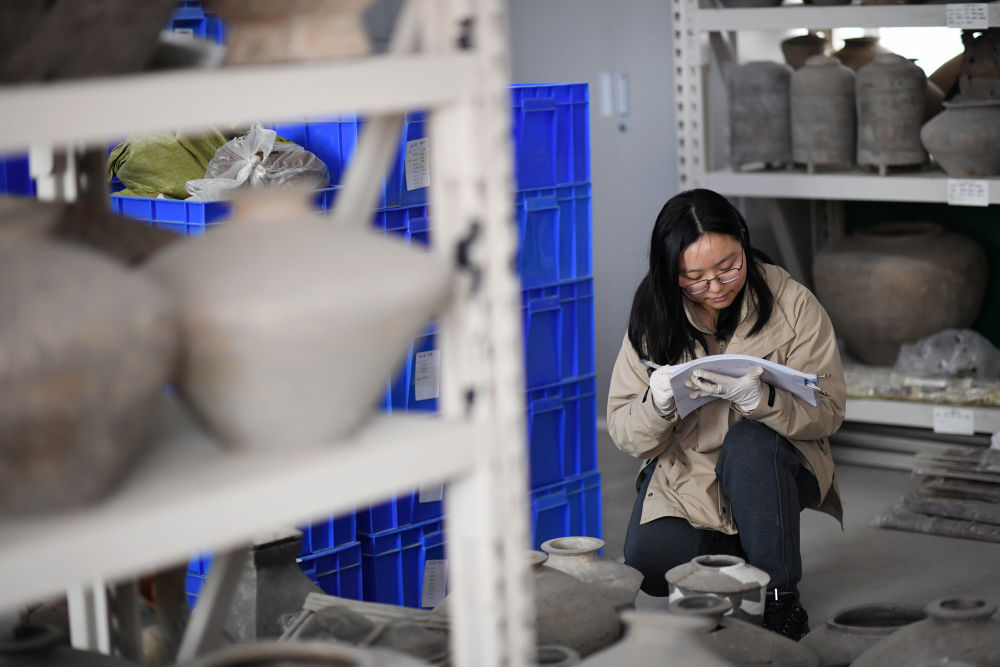 2024年3月5日,陜西省考古研究院女子考古隊(duì)隊(duì)員張佳楊在文物庫房登記文物信息。成立于2020年的女子考古隊(duì)先后完成包括蔣劉仰韶晚期環(huán)壕聚落、大堡子西漢陵邑墓地等重要發(fā)現(xiàn)在內(nèi)的基本建設(shè)考古項(xiàng)目數(shù)十項(xiàng)。