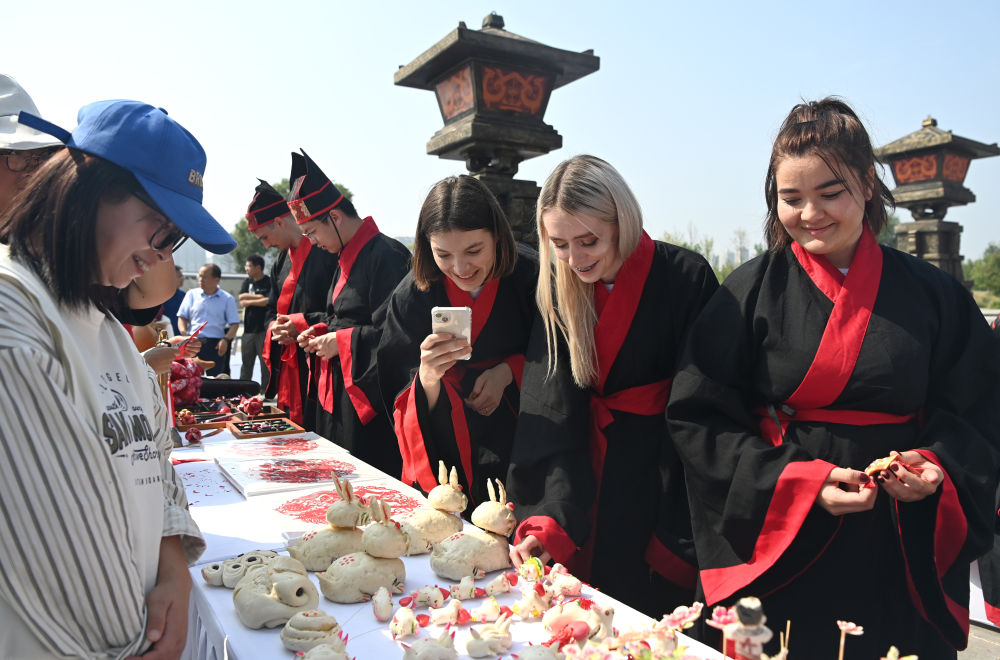 2023年9月16日,“絲路起點(diǎn) 文明根脈”2023西安絲路留學(xué)生交流活動(dòng)在西安啟動(dòng),來自西安交通大學(xué)的百名中外大學(xué)生著漢服、行漢禮,通過沉浸式體驗(yàn),了解中國傳統(tǒng)文化。這是中外大學(xué)生在交流活動(dòng)上了解陜西非遺。