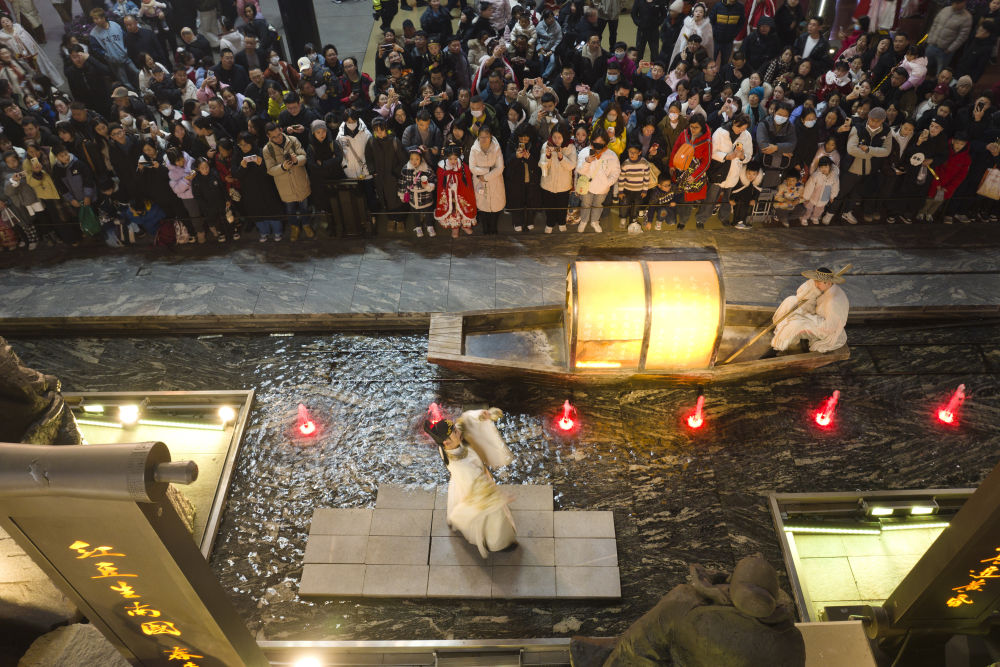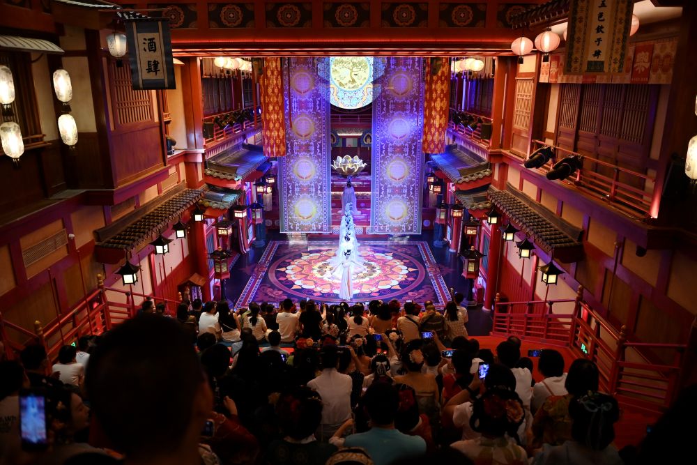 2024年5月12日,游客在西安長安十二時(shí)辰主題街區(qū)內(nèi)觀看演出。街區(qū)通過漢服旅拍、演藝互動(dòng)、非遺體驗(yàn)等項(xiàng)目,讓游客“穿越”回盛唐長安,為游客打造科技感、文化味十足的游歷體驗(yàn)。