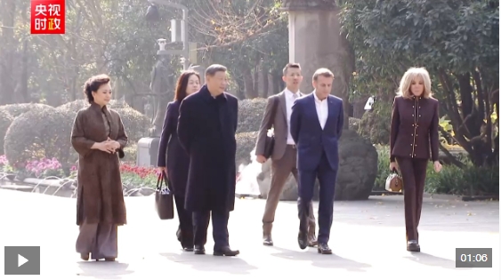 初冬的都江堰,蒼山掩翠。馬克龍夫婦抵達時,受到習近平和彭麗媛熱情迎接。兩國元首夫婦沿堰功道邊走邊談。習近平介紹都江堰歷史和意義,指出都江堰水利工程是全世界迄今唯一仍在使用的古代水利工程,也是人類與自然和諧共生最早的成功實踐之一,修建過程充分反映了中華民族自強不息、不畏艱難、勇于開拓的精神。兩國元首夫婦落座懷古亭,臨水品茗,縱論天下。