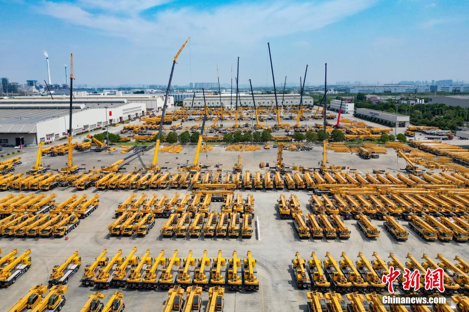 資料圖:徐工集團生產車間外停放的起重機。(無人機照片)泱波 攝