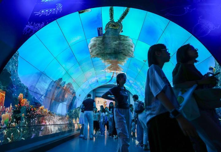 2025年7月15日,游客在玉溪市澄江化石地世界自然遺產(chǎn)博物館“寒武紀(jì)海底隧道”參觀。