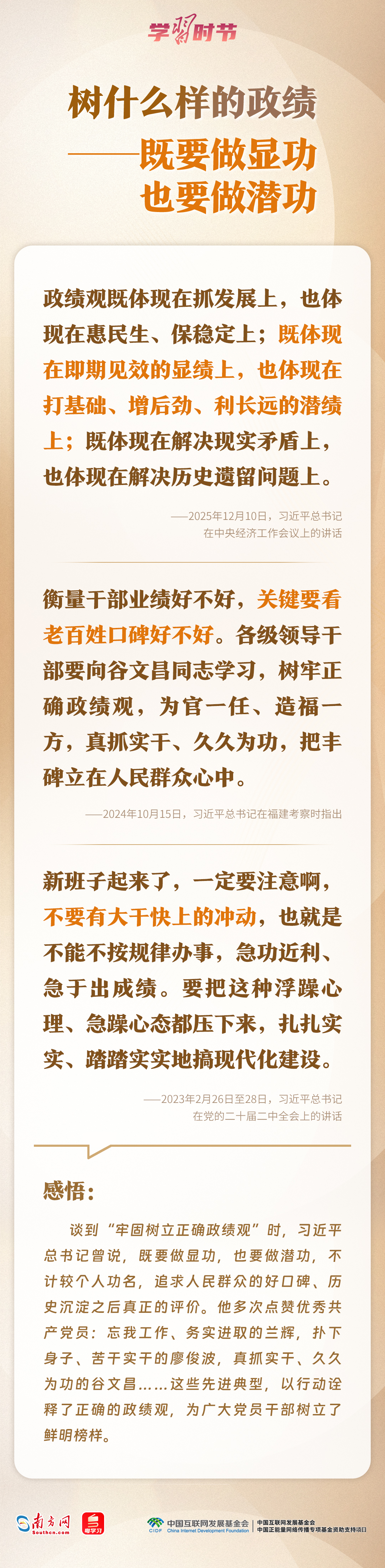 黨的十八大以來,習(xí)近平總書記對樹立和踐行正確政績觀作出一系列重要論述,深刻闡明了“政績?yōu)檎l而樹、樹什么樣的政績、靠什么樹政績”等重大問題,為廣大黨員干部提供了重要遵循。一起來學(xué)習(xí)感悟。