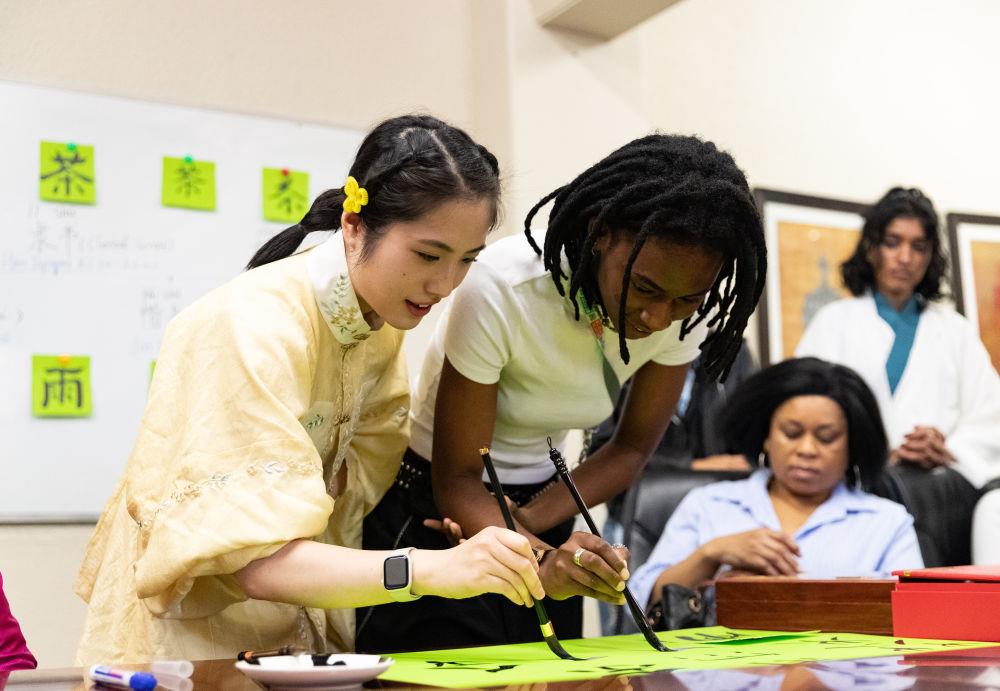 2025年4月17日,在南非約翰內(nèi)斯堡,學(xué)生與孔子學(xué)院志愿者在“國際中文日”活動(dòng)上寫毛筆字。
