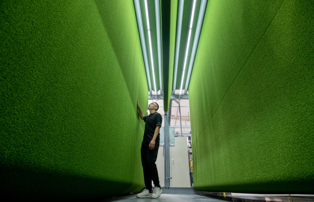 在山東省樂(lè)陵市泰山體育產(chǎn)業(yè)集團(tuán)人造草坪智能化生產(chǎn)車(chē)間,工人在檢測(cè)產(chǎn)品。新華社記者 范長(zhǎng)國(guó) 攝
