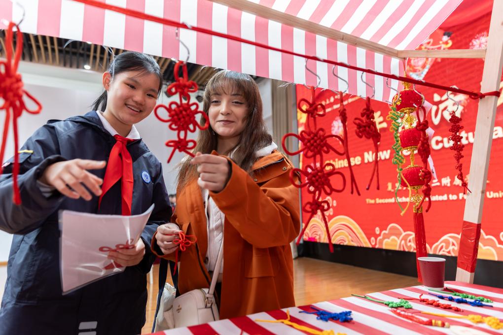 2024年1月28日,復旦大學第二附屬學校學生(左)為美國馬斯卡廷中學學生(右)介紹中國結(jié)。新華社記者 王翔 攝