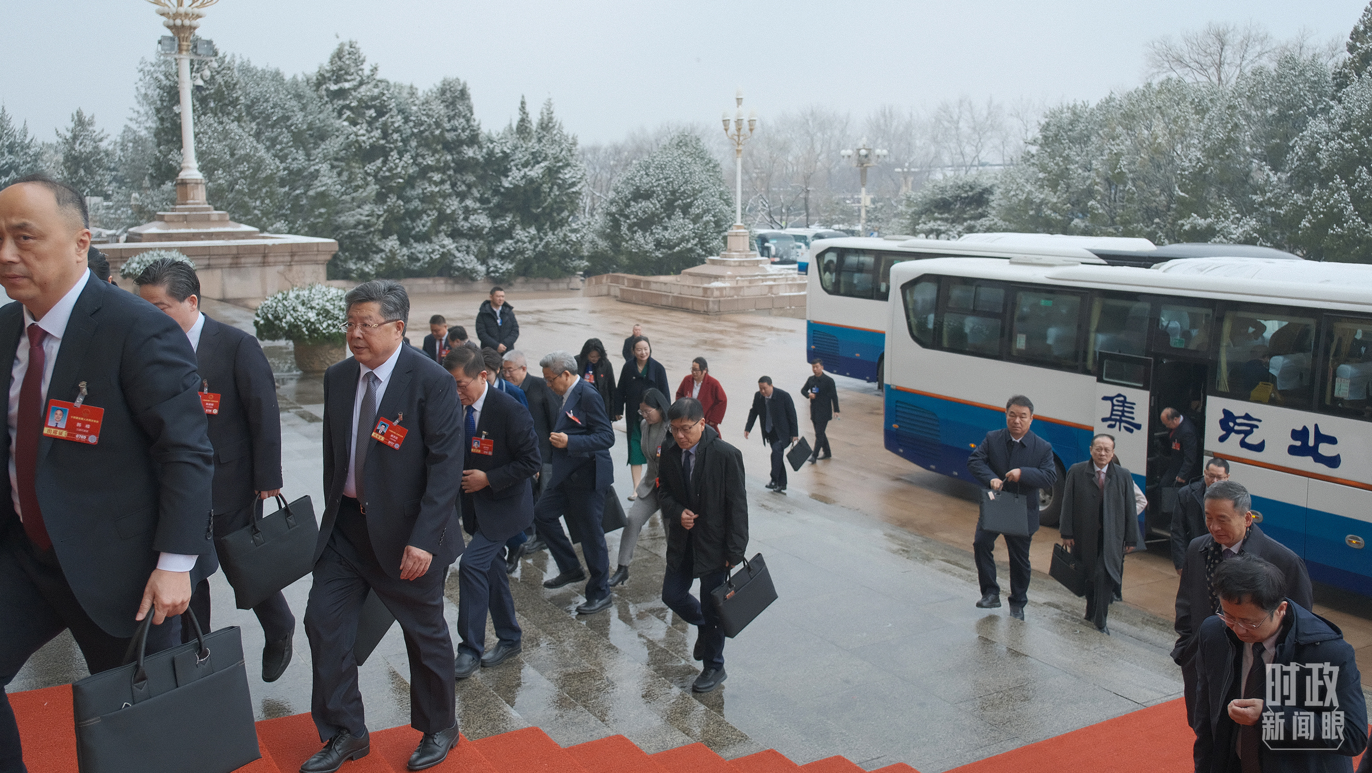 江蘇代表團乘車前往人民大會堂。(總臺記者黃成拍攝)