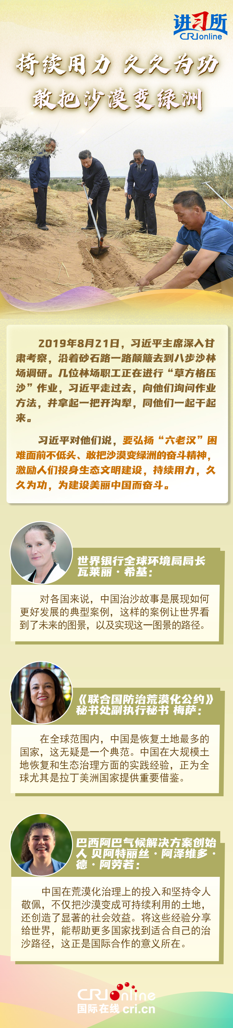 中共十八大以來,中國(guó)森林面積和蓄積量持續(xù)“雙增長(zhǎng)”,荒漠化和沙化土地面積持續(xù)“雙縮減”,是全球增綠最多最快的國(guó)家。習(xí)近平主席始終身體力行:在北京連續(xù)14年參加首都義務(wù)植樹活動(dòng),在甘肅與林場(chǎng)職工一起進(jìn)行“草方格壓沙”作業(yè),在陜西親自“驗(yàn)收”秦嶺生態(tài)保護(hù)……
