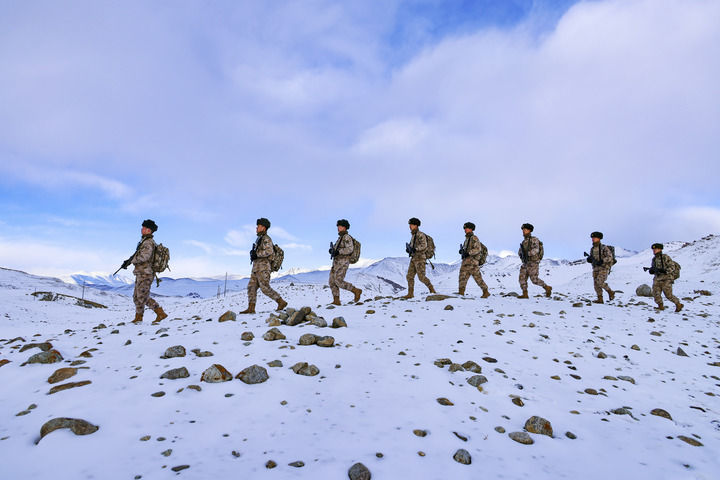 2024年2月9日,駐守帕米爾高原的新疆軍區(qū)某邊防團(tuán)紅其拉甫邊防連官兵踏雪巡邏。新華社發(fā)(姬文志 攝)