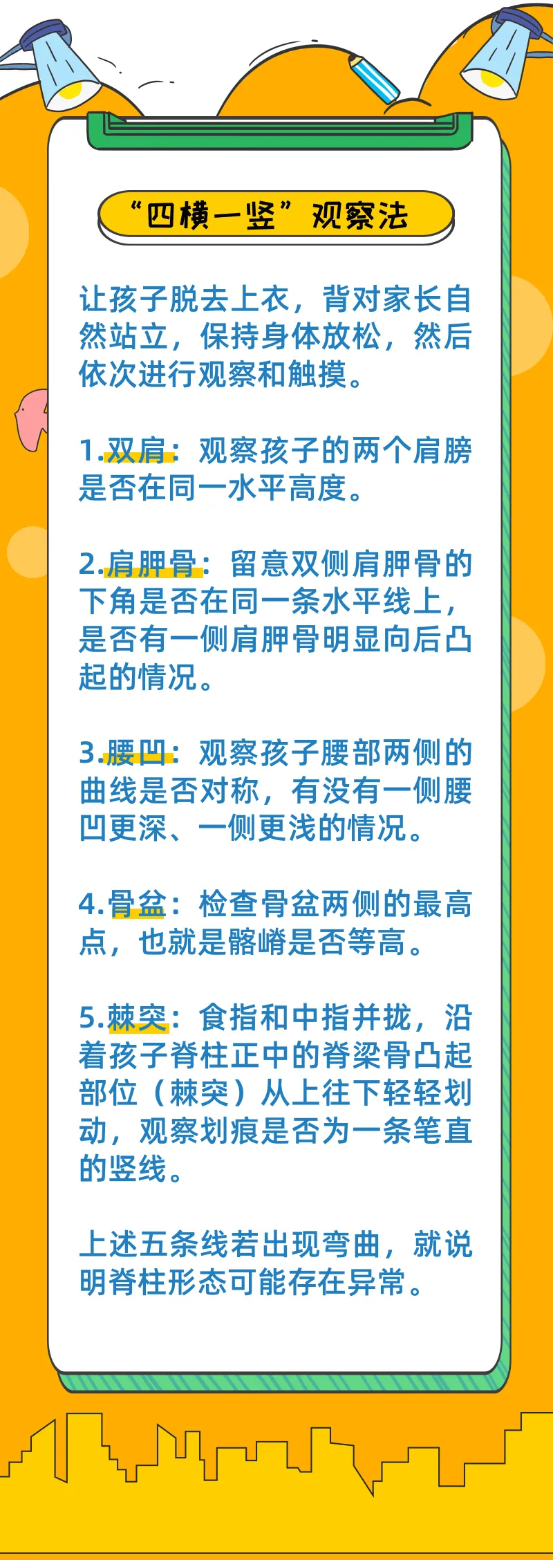 守護(hù)孩子的脊柱健康,家庭是第一道“崗哨”。家長掌握簡單、有效的自查方法,能第一時(shí)間發(fā)現(xiàn)孩子脊柱的異常信號。這里教大家一個(gè)簡單易操作的“四橫一豎”觀察法,在家就能給孩子做篩查。