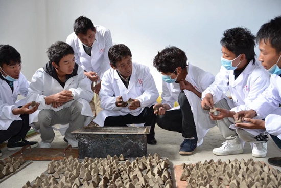 學(xué)校校長(zhǎng)尼瑪次仁進(jìn)行“傳統(tǒng)藏藥炮制工藝”實(shí)踐教學(xué)