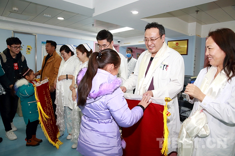 返鄉(xiāng)前,洛桑曲宗和次旦德吉在親屬和小學校長的帶領(lǐng)下來到兒研所,向醫(yī)護人員和共鑄中國心組委會的工作人員獻上了哈達和錦旗,表達感激之情。醫(yī)護人員也向兩個孩子贈送了書包等文具,鼓勵他們回校后好好學習。