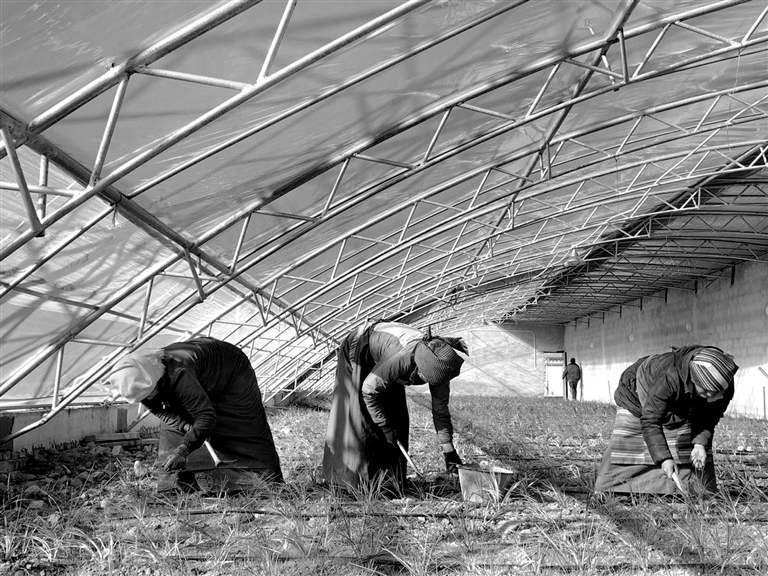 技術(shù)員達(dá)瓦次仁正在大棚里指導(dǎo)園區(qū)的員工種植藏紅花的種球。挖坑、放種球、填土……一套動作下來,一顆種球就被完美地種下了。