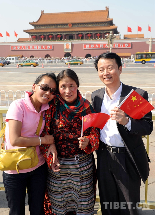 這是斯求卓瑪(中)和藏醫(yī)兼翻譯的旦增達(dá)色(左),以及一直幫助她的中石化首批援藏干部李一超(右)一起在北京天安門廣場合影留念。(唐召明2010年5月1日攝)