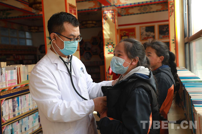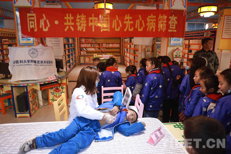 北京天壇醫(yī)院心臟外科馬浩在為當(dāng)?shù)貙W(xué)生聽診