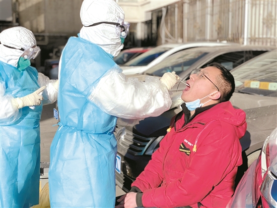 圖為拉薩市城關(guān)區(qū)衛(wèi)健委組織的核酸采樣人員正在為轄區(qū)內(nèi)重點崗位從業(yè)人員進(jìn)行咽拭子采樣。 記者 旦增拉珍 攝