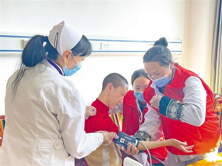 圖為志愿者們協(xié)助醫(yī)生,給那曲市殘疾人聯(lián)合會(huì)殘疾人康復(fù)托養(yǎng)中心的患者測(cè)量血壓。記者 萬(wàn)靖 攝
