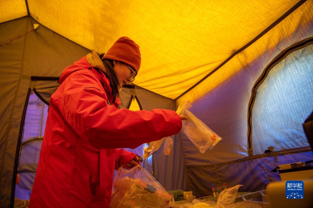 珠峰大氣與人體健康科考分隊(duì)成員在整理采集到的樣本(5月1日攝)。新華社記者 李鍵 攝