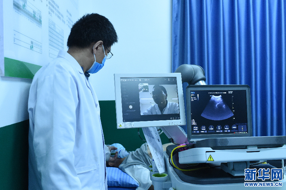 圖為醫(yī)生通過(guò)5G遠(yuǎn)程超聲診斷的形式進(jìn)行會(huì)診(6月20日攝)。新華網(wǎng)旦增努布 攝