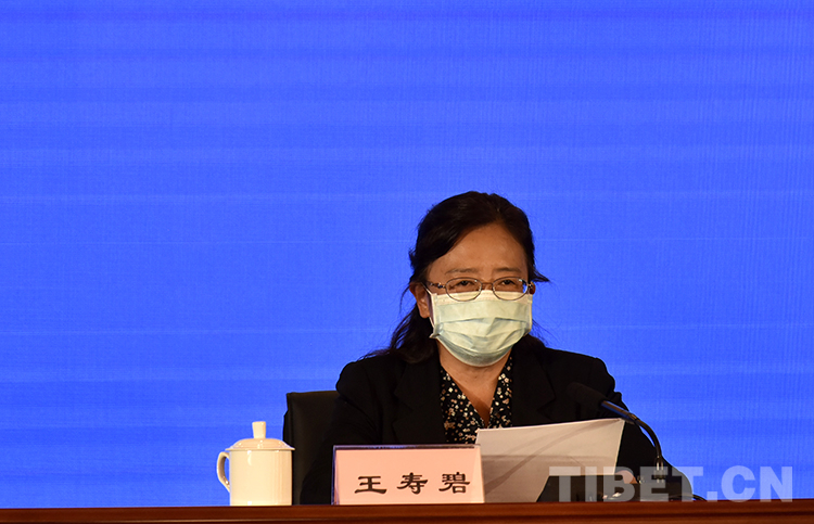 圖為西藏自治區(qū)新型冠狀病毒肺炎疫情防控工作第三場(chǎng)新聞發(fā)布會(huì)上,西藏自治區(qū)衛(wèi)生健康委員會(huì)一級(jí)巡視員王壽碧介紹西藏新冠肺炎疫情防控工作最新情況 攝影:王媛媛