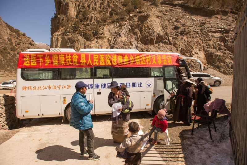 一輛八米多長(zhǎng)的農(nóng)牧民健康體檢車按照年度計(jì)劃,穿梭于比如縣的大小鄉(xiāng)村。車上載有先進(jìn)的DR(數(shù)字影像攝片機(jī))、便攜彩超機(jī)、心電圖機(jī)、便攜檢驗(yàn)設(shè)備。這臺(tái)車是浙江省援藏副指揮長(zhǎng)、比如縣委常務(wù)副書(shū)記盛悠聯(lián)系寧波市江北區(qū)政府捐贈(zèng)的。在第八批寧波紹興援藏工作組干部的精心設(shè)計(jì)下,專門向宇通公司定制的一輛功能齊全的大巴體檢車,光車底和改裝費(fèi)用就達(dá)73萬(wàn)元。它與普通體檢車需要接入停泊地市電、自來(lái)水才能運(yùn)行不同,寧波的援藏干部根據(jù)西藏鄉(xiāng)村缺電少水的現(xiàn)狀,多方咨詢方案,最后增加了價(jià)值十萬(wàn)元的高壓電容設(shè)備,實(shí)現(xiàn)了通過(guò)車載的小型發(fā)電機(jī)帶動(dòng)50千瓦的DR,并可連續(xù)運(yùn)轉(zhuǎn),這在全國(guó)尚屬首例。車上還配備主動(dòng)式抽水泵,解決上水問(wèn)題,并配有空調(diào)系統(tǒng)。車子開(kāi)到哪里,便可不靠外力,進(jìn)行包括拍攝X光片、彩超、心電、檢驗(yàn)等的全面健康體檢,許多鄉(xiāng)鎮(zhèn)衛(wèi)生院也不如這輛體檢車的配置強(qiáng)大。
