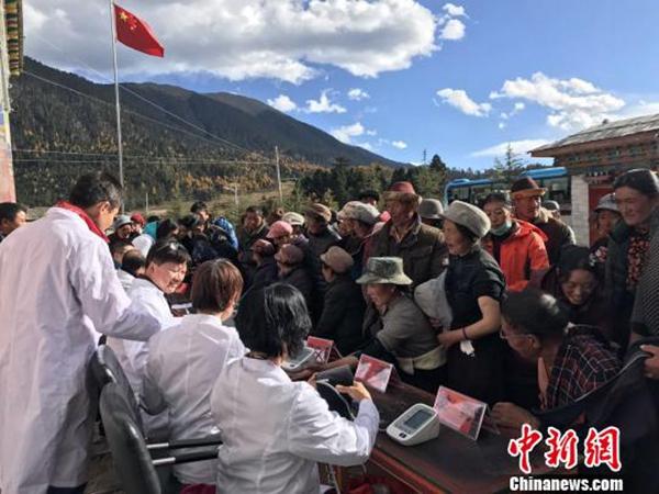 圖為援藏醫(yī)生為林芝農牧民義診贈藥。圖片來源:中新網 攝影:張寧