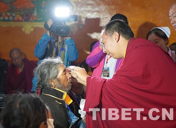 圖為十一世班禪為白內(nèi)障患者揭紗。攝影:王淑