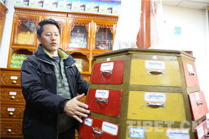 圖為德格藏醫(yī)院副院長伍金丹增向記者展示傳統(tǒng)裝藏藥的藥盒。