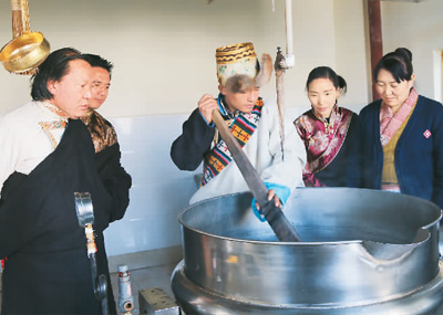 藏醫(yī)藥浴法代表性傳承人明珠(左)指導(dǎo)瀧沐覺堪(制藥師)煎熬“五味甘露”。關(guān)確才讓攝