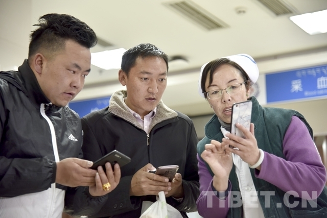 圖為西藏自治區(qū)人民醫(yī)院工作人員正在指導(dǎo)前來(lái)就診的群眾使用手機(jī)微信掛號(hào)。