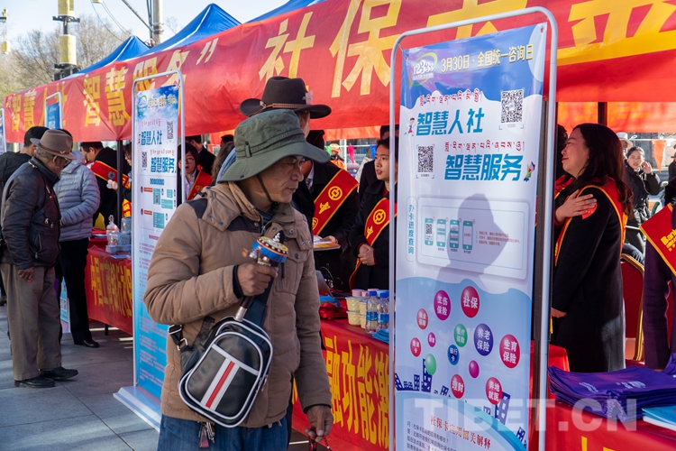 圖為西藏自治區(qū)人力資源和社會保障廳舉行的社??ㄗ稍冃麄骰顒蝇F(xiàn)場。