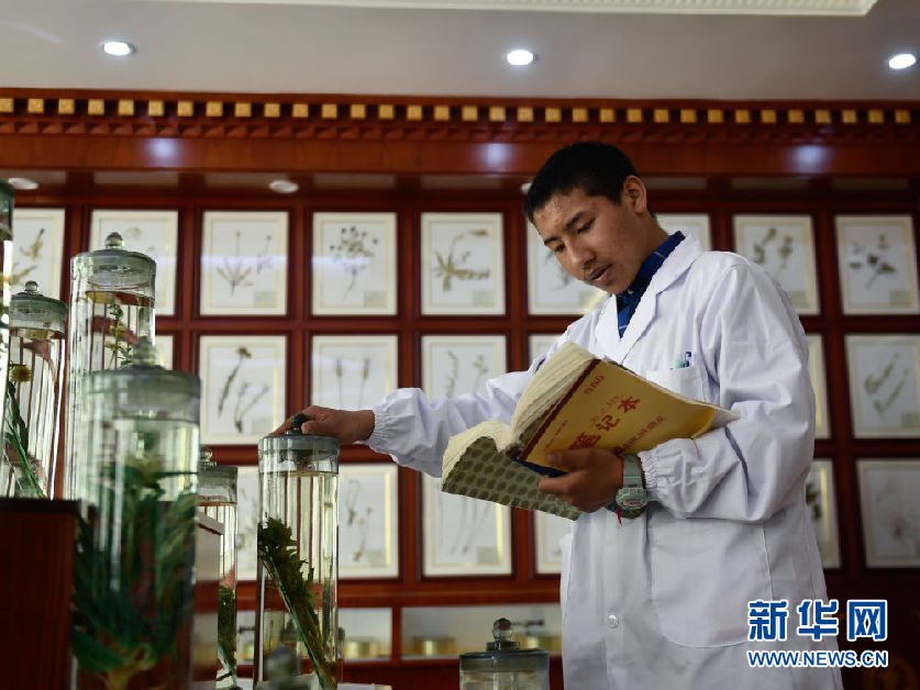 3月16日,在果洛藏族自治州職業(yè)技術學校,2020級藏醫(yī)醫(yī)療與藏藥專業(yè)學生華旦在草藥標本館內辨認藥材。新華社記者 張龍 攝