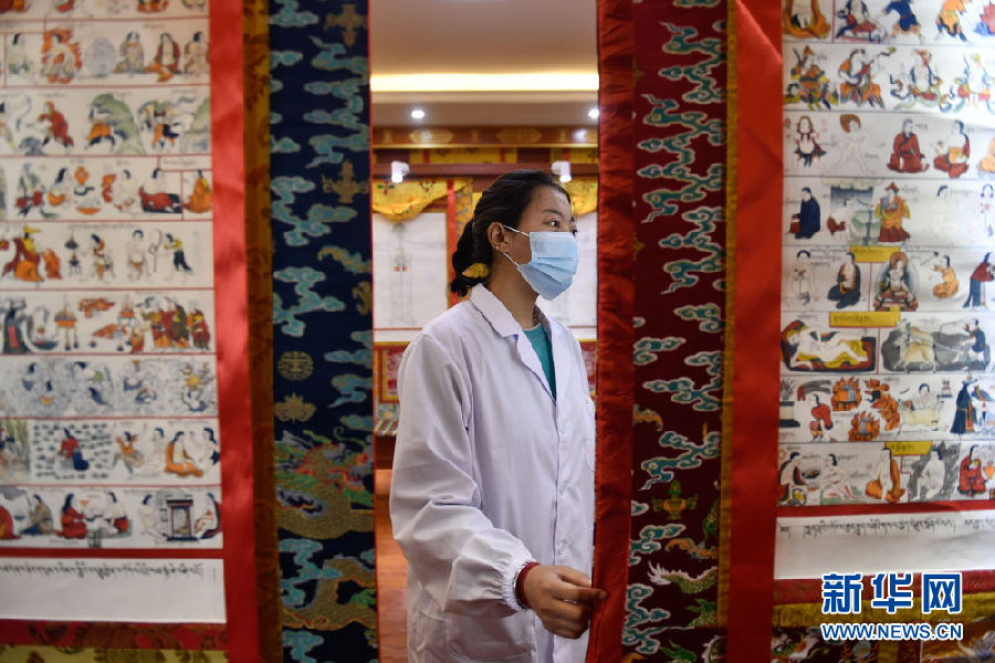 3月16日,在果洛藏族自治州職業(yè)技術學校,2020級藏醫(yī)醫(yī)療與藏藥專業(yè)學生才讓措通過藏醫(yī)典籍唐卡學習。新華社記者 張龍 攝