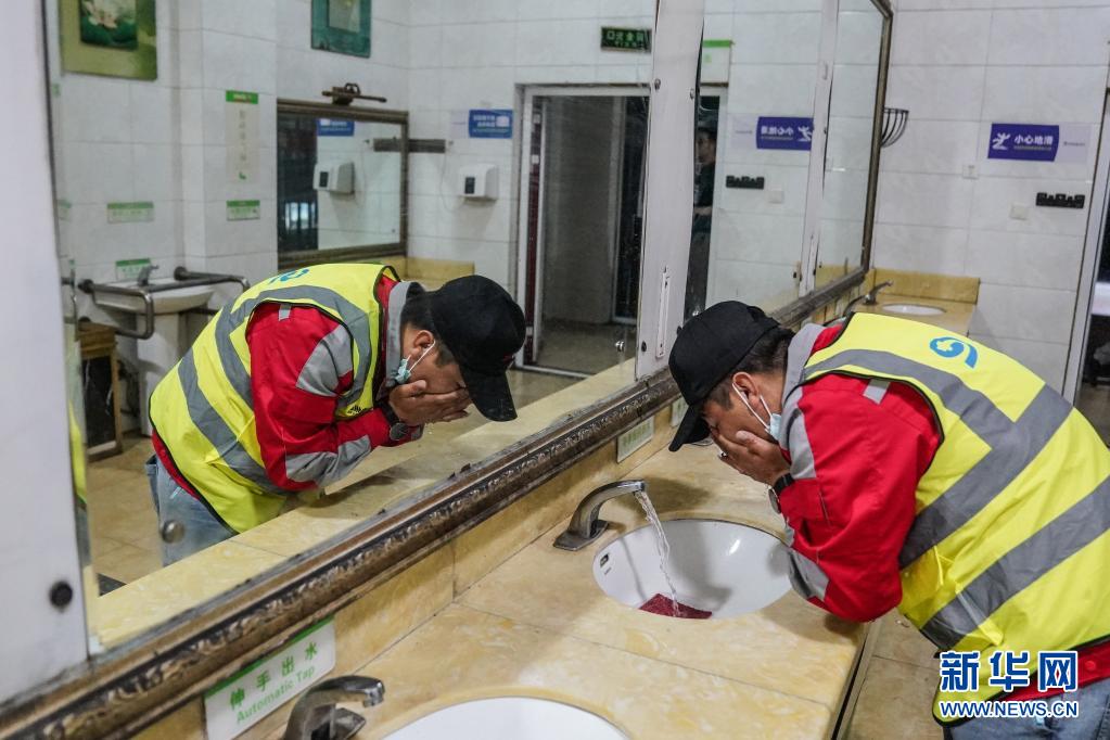 7月20日深夜,在河北保定服務(wù)區(qū)休息時(shí),司機(jī)蘆艷會(huì)在衛(wèi)生間洗臉。新華社記者 彭子洋 攝