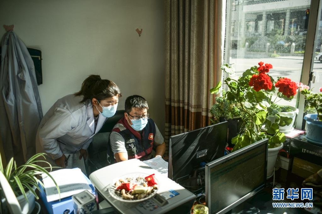 7月23日,四川甘孜州疾控中心工作人員黃亮(右)在稻城縣疾控中心與當(dāng)?shù)毓ぷ魅藛T對(duì)接疫苗信息。新華社記者 彭子洋 攝