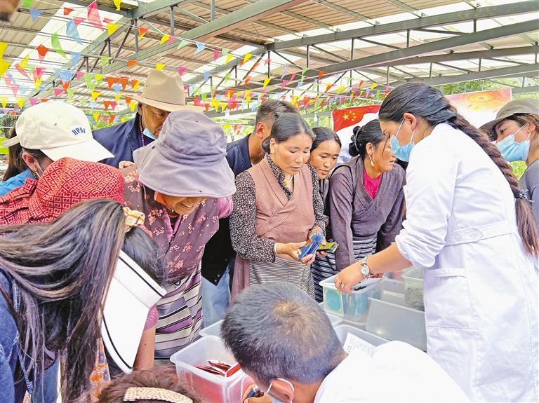 圖為朗縣藏醫(yī)院醫(yī)務(wù)人員向村民耐心講解藥品具體服用方法。記者 張猛 王珊 謝筱純 攝