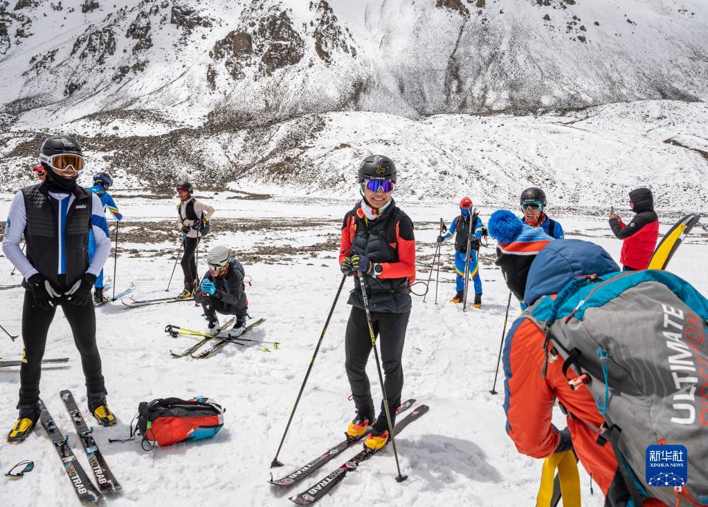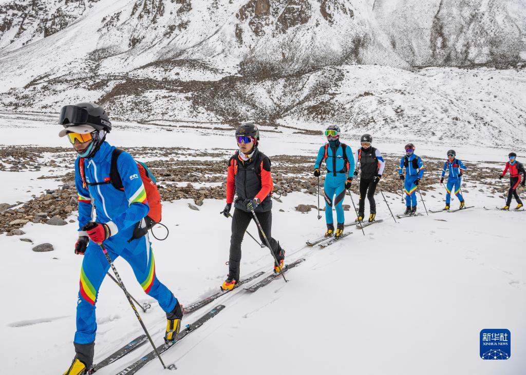 在西藏拉薩市當(dāng)雄縣羊八井鎮(zhèn),玉珍拉姆(左二)和隊友進(jìn)行滑雪登山訓(xùn)練(5月2日攝)。新華社記者 孫非 攝