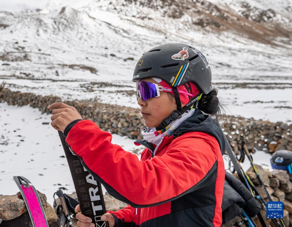 在西藏拉薩市當(dāng)雄縣羊八井鎮(zhèn),玉珍拉姆在訓(xùn)練前為雪板粘貼止滑帶(5月2日攝)。新華社記者 孫非 攝