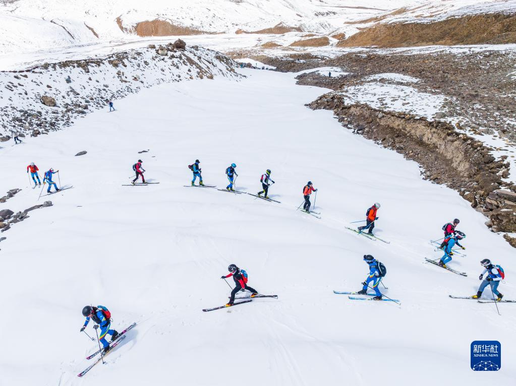 在西藏拉薩市當(dāng)雄縣羊八井鎮(zhèn),玉珍拉姆(前排左二)和隊友進(jìn)行滑雪登山訓(xùn)練(5月2日攝,無人機照片)。新華社記者 孫非 攝
